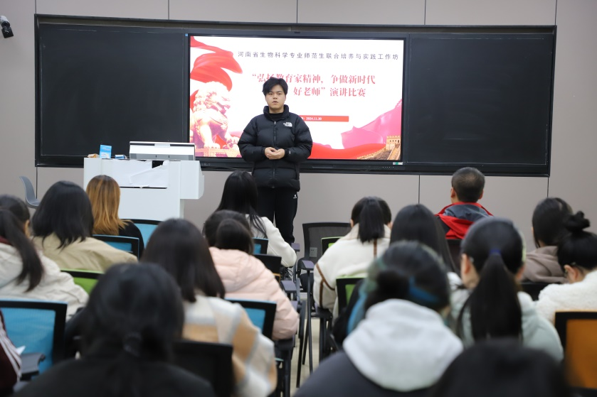 2024年12月1日,河南省生物科学专业师范生第六成长工作坊在教9-209成功举办了一场以“弘扬教育家精神,争做新时代四有好老师”为主题的演讲比赛。此次活动旨在提升师范生对教育家精神的深刻理解与感悟,进一步坚定其投身教育事业的信念与决心。