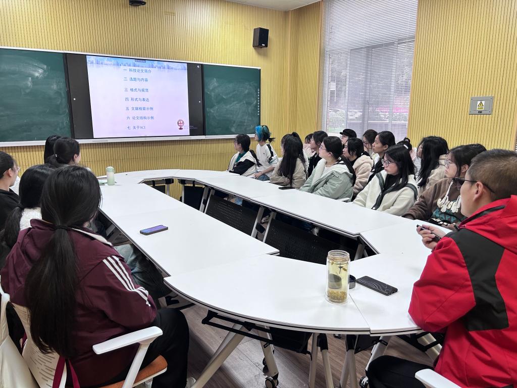 在论文写作的部分,吴老师从论文的结构框架入手,逐一阐述了标题、摘要、引言、方法和正文等部分的撰写要点。他强调论文逻辑的连贯性和观点阐述的清晰性,鼓励同学们在日常学习中注重积累,逐步培养学术思维和表达能力。此外,吴老师结合自身的科研经验,分享了在文献检索与论文写作过程中可能遇到的问题及解决途径,并与同学们进行了互动交流,耐心解答了大家提出的疑问,现场气氛热烈。