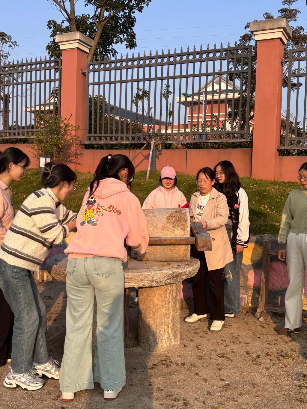 随后,活动进入“溯古韵,悟匠心”——传统农耕器具认知环节。学员们围聚在石磨展区,怀着浓厚的兴趣,聆听老师讲述石磨的历史渊源、发展演变及其在中华农耕文明中的重要地位。夏老师详细讲解了石磨的工作原理、使用方法以及它在传统粮食加工中不可替代的作用。部分学员在老师的指导下,亲身体验了推磨的过程,深刻感受到了先辈们的生产生活智慧与精益求精的工匠精神。这一环节将生物科学知识与历史、人文相结合,拓宽了学员们的学科视野。