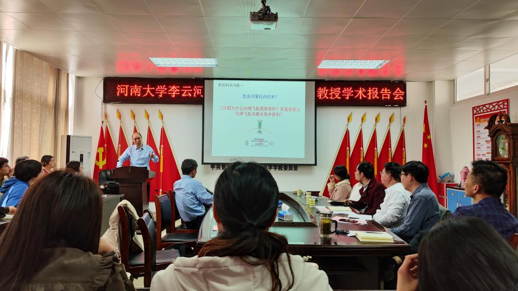 2023年3月9日上午,应太阳成集团122ccvip邀请,河南大学周树堂教授和李云河教授在生物楼412会议室,分别做了题为“昆虫高生殖力的遗传基础与分子调控机制解析”和“二化螟与褐飞虱协作应对水稻抗虫防御的生态和分子机制”的学术报告,我院青年教师及部分学生聆听了报告。报告会由院长饶本强教授主持。