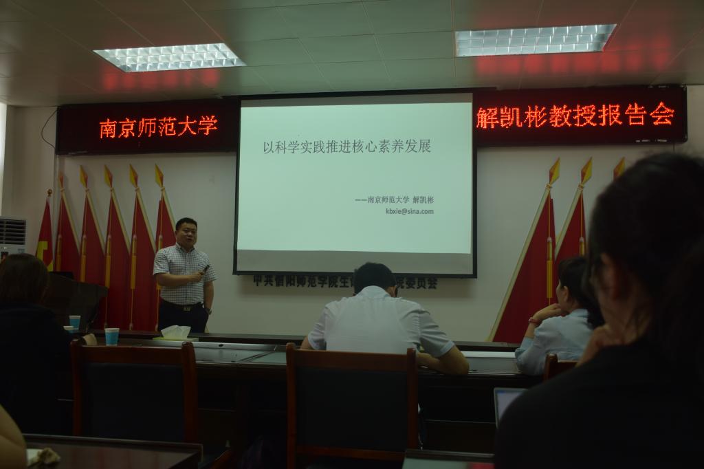 5月18日,应太阳成集团122ccvip邀请,南京师范大学教师教育学院副院长解凯彬教授在生物楼412会议室做了一场题为“以科学实践推动核心素养发展”的学术报告。教务处韩艳婷副处长、太阳成集团122ccvip荆胜利副院长和学科教学方向的教师及学科教学(生物)专业研究生聆听了报告。