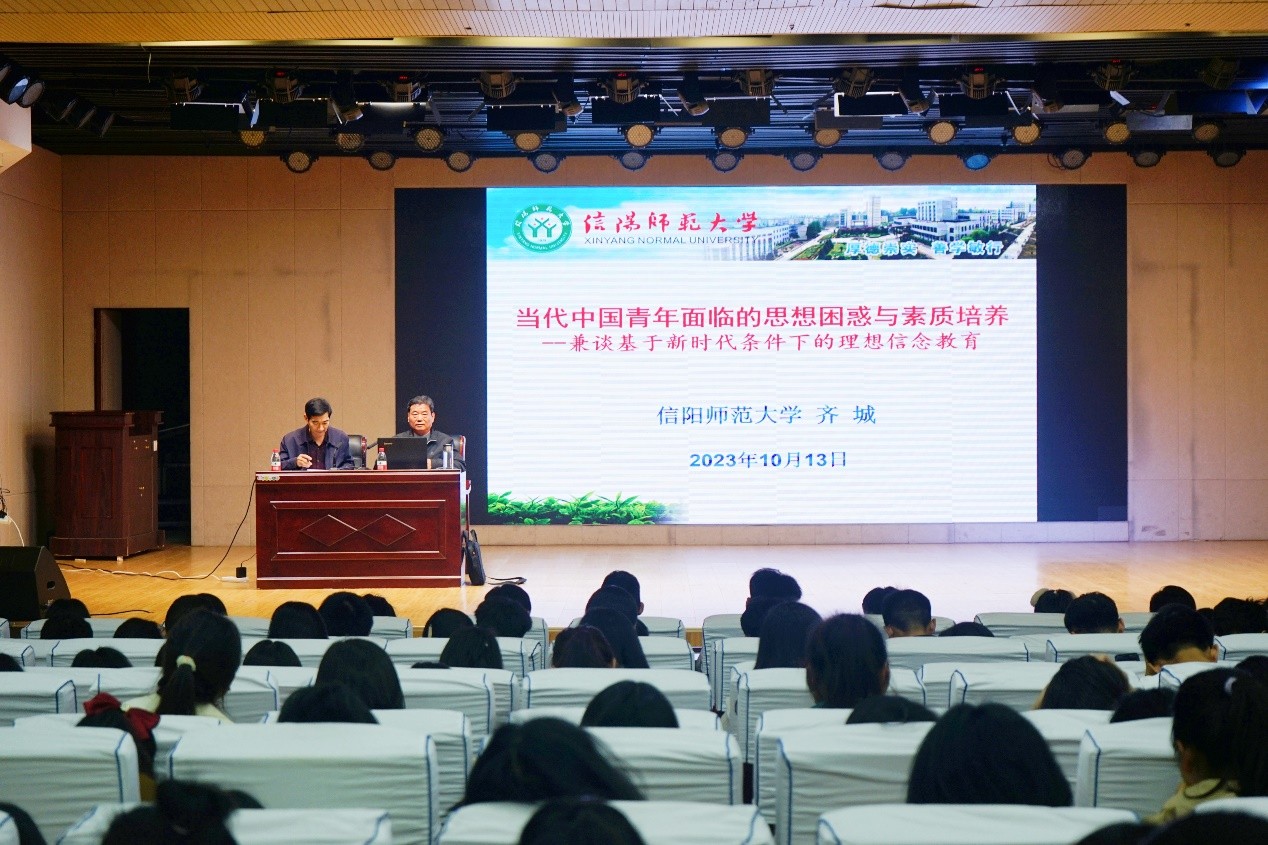 为帮助新生尽快适应大学生活,明确未来的目标与方向,树立新时代大学生该有的素质和本领。我院与物理电子工程学院于10月13日晚在理科楼报告厅召开了以“当代中国青年面临的思想困惑与素质培养——兼谈基于新时代条件下的理想信念教育”为主题的新生入学教育,此次报告由太阳成tyc122cc集团原副校长齐城主讲,我院及物理电子工程学院2023级全体新生参加。