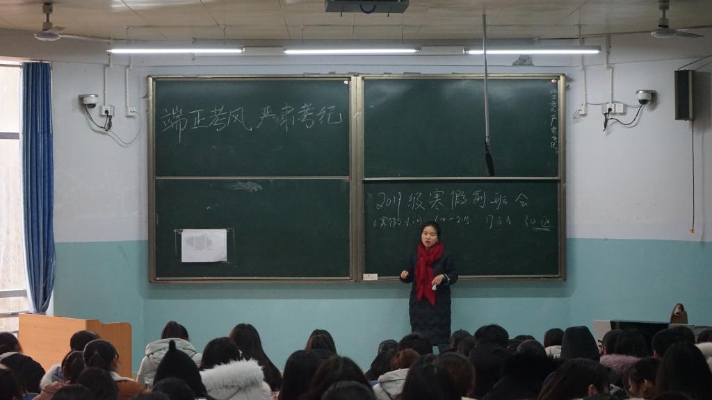 杨娟娟主要从寒假回家和返程时间、假期防骗、转专业三个方面展开说明。她强调,同学们回家途中要注意财产安全问题,增强防范意识,提高警惕,临近假期结束要尽早准备返程车票,按时到校上课。同时,嘱咐19级转专业同学要及时关注学习关于转专业动态,了解下学期的具体安排。朱晓雯对17级学子详细讲解期末考试考场纪律及考研现状,着重强调诚信考试的重要性。她要求学子们端正考试态度,诚信考试,同时鼓励学子们积极考研,认清考研现状,及早做好考研准备,避免误入盲区。