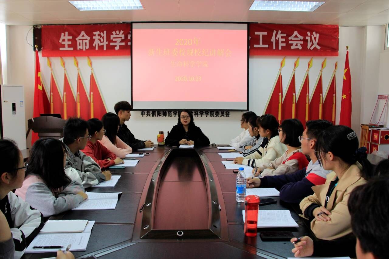 为帮助2020级新生深入了解校规校纪,更好地适应校园生活,10月23日,我院于生物楼412会议室召开2020年新生班委校规校纪讲解会,我院团委书记熊蕾主持会议并发表讲话,学生会副主席吕泓达及2020级各班班长团支书参加此次会议。