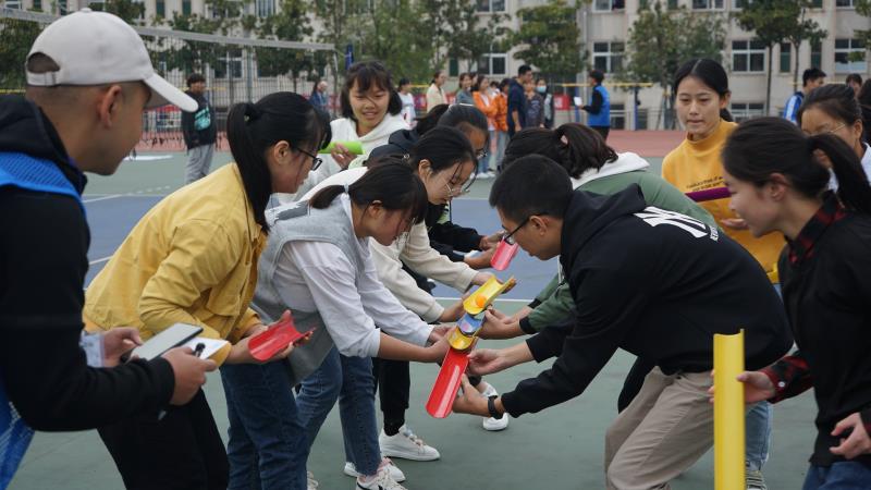 活动现场,学子井然有序地集合站队并完成分组。此次活动共组织安排“珠行万里”、“旱地龙舟”、“不倒森林”和“摸石过河”四个游戏环节。“珠行万里”环节中,需所有参与者用球槽共同传递一个乒乓球至终点,保证乒乓球不掉落。在“旱地龙舟”环节中,学子们集体坐在龙舟上,齐心协力到达终点。“不倒森林”环节,学子们围成一个圈,在确保塑料管不倒的前提下用最短时间完成传递,该项目有利于提高学子们的专注能力与反应能力。“摸石过河”环节主要考验学子们的团队合作能力,我院学子通过分工协作,最终完成挑战。