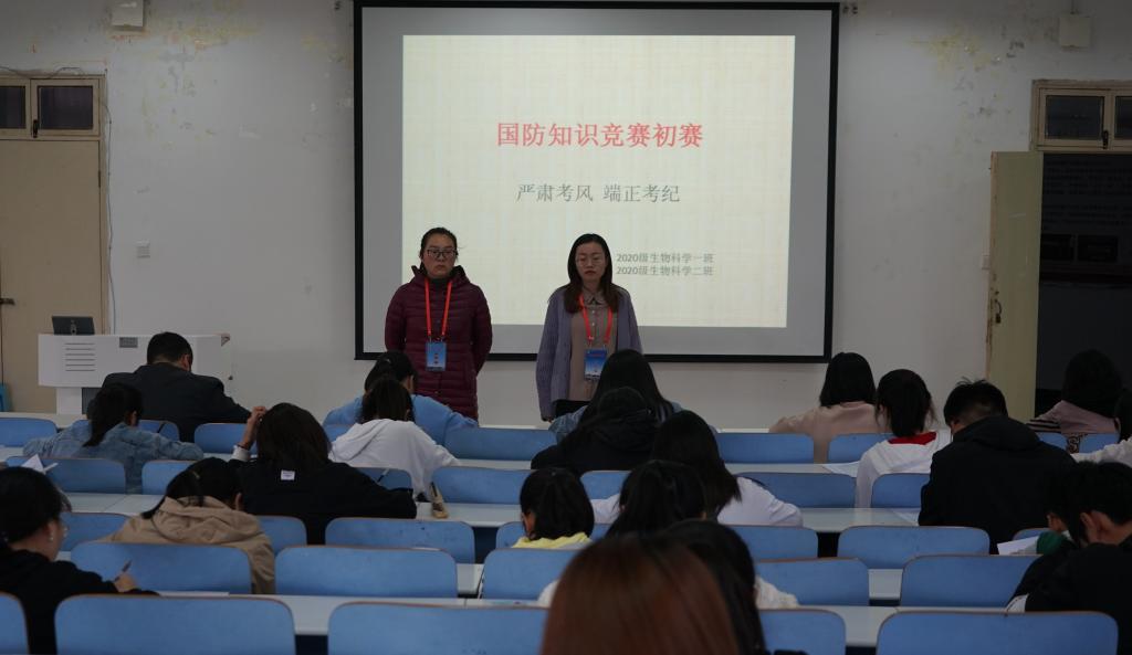 为普及国防安全知识,增强大学生的国家安全意识,11月5日中午,我院于生物楼414多媒体教室、教九楼305教室开展国防知识竞赛初赛,2020级专职辅导员李敏与武装干事朱晓雯前往考场进行巡视检查,2020级百余名学子参与此次竞赛。