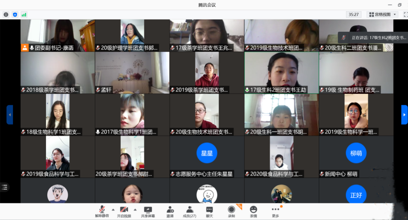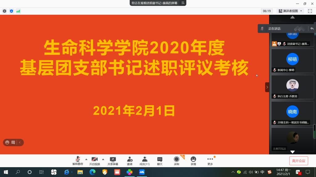 为加强团支部建设及团员交流学习,深入贯彻习近平新时代中国特色社会主义思想,进一步推动优秀团组织向基层延伸。2月1日,我院以腾讯会议形式线上开展了2020年度基层团支部书记述职评议考核会议,团委书记熊蕾同学生会执行主席乔群龙等学生干部及各级各班团支书共同参与此次会议,会议由团委副书记康菡主持。