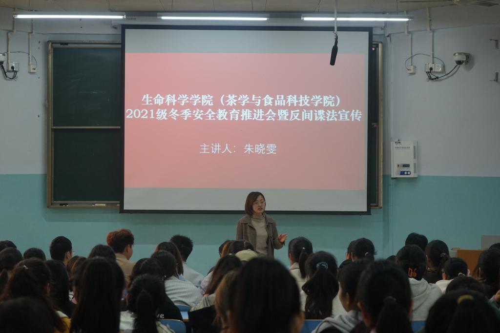 为了推进我院冬季安全教育,提高2021级新生对《中华人民共和国反间谍法》的认识和自身安全防范意识, 11月1日中午,我院于教九楼305开展2021级冬季安全教育推进会暨反间谍法宣传,会议由2021级专职辅导员朱晓雯主持,全体2021级学生参加。