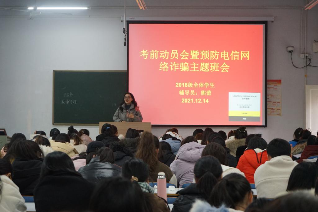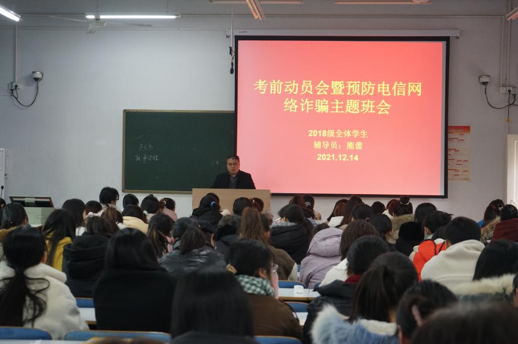 为进一步增强我院2018级学子考研信心,部署全国英语四、六级考试及期末考试工作,谨防电信网络诈骗,营造积极向上的备考氛围与安全和谐的校园环境。12月14日下午,我院在教九楼207教室召开2018级考前动员会暨预防电信网络诈骗主题班会。党委副书记荣宪举及2018级全体学生参加。会议由熊蕾主持。