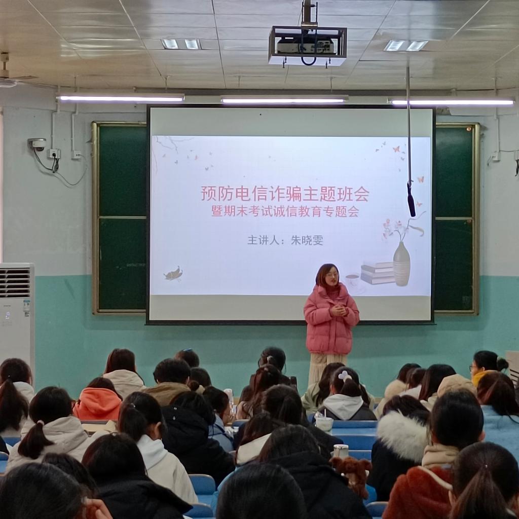 会议中,朱晓雯主要围绕“什么是电信诈骗”、“电信诈骗的常见形式”、“如何防范电信网络诈骗”以及“上当后的补救措施”等内容展开,结合电信诈骗案例向同学们具体讲解了诈骗人员的诈骗手段和诈骗心理,并提出了具体的防范措施,以便同学们有效地防范电信诈骗。同时提醒同学们及时调整学习状态,为期末考试做好充分准备,坚决不打无准备之战。为严肃考风考纪,树立良好的学风,她详细讲解了校规校纪中有关考试条例,并且着重强调了遵守考试纪律的重要性,提醒同学们严格按照学校的相关规定诚信考试,警示同学们千万不要心存侥幸心理。
