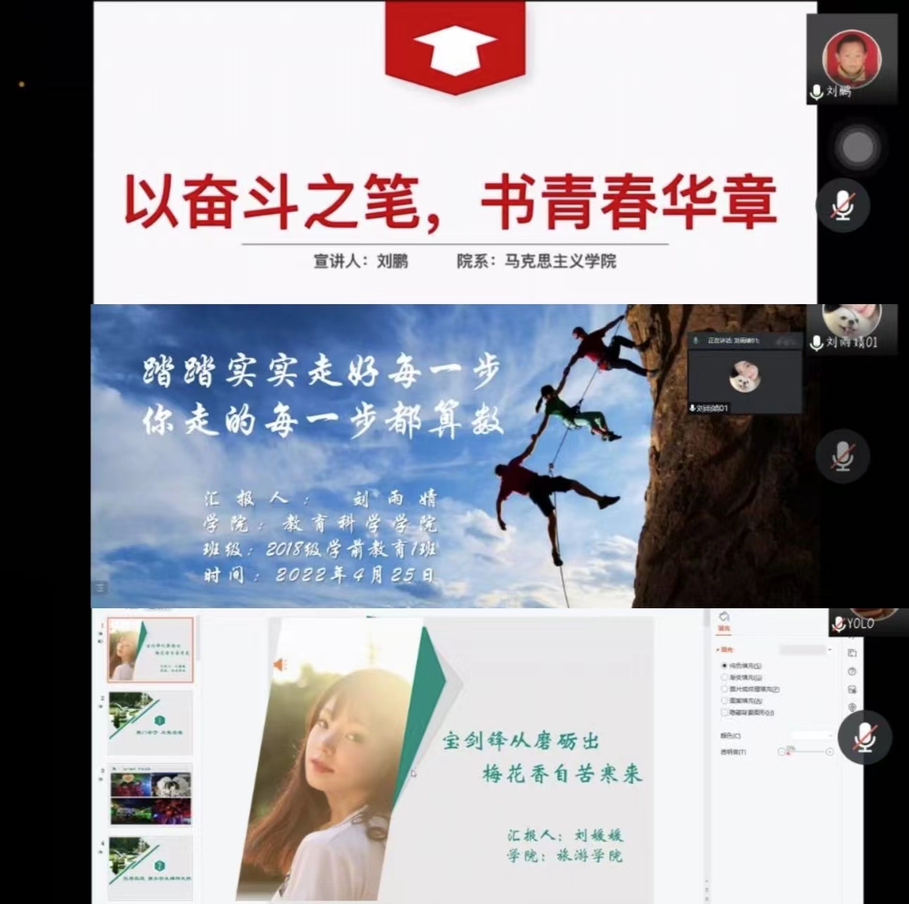 为了进一步加强学校德育工作,充分展示我校学生的精神风貌,发挥榜样的模范带头作用,营造积极向上的学习氛围,鼓励和激发同学们向身边的榜样学习,增强校园活力。4月27日晚,我院志愿服务中心助贷部以线上腾讯会议形式开展了“榜样红”——身边的榜样宣讲活动,我院资助专员李敏参加了宣讲活动,我校马克思主义学院国家奖学金获得者刘鹏、教育科学学院校园明星刘雨晴和旅游学院自强之星刘媛媛受邀进行宣讲,我院全体学生和学校兄弟学院部分学生聆听了此次宣讲。