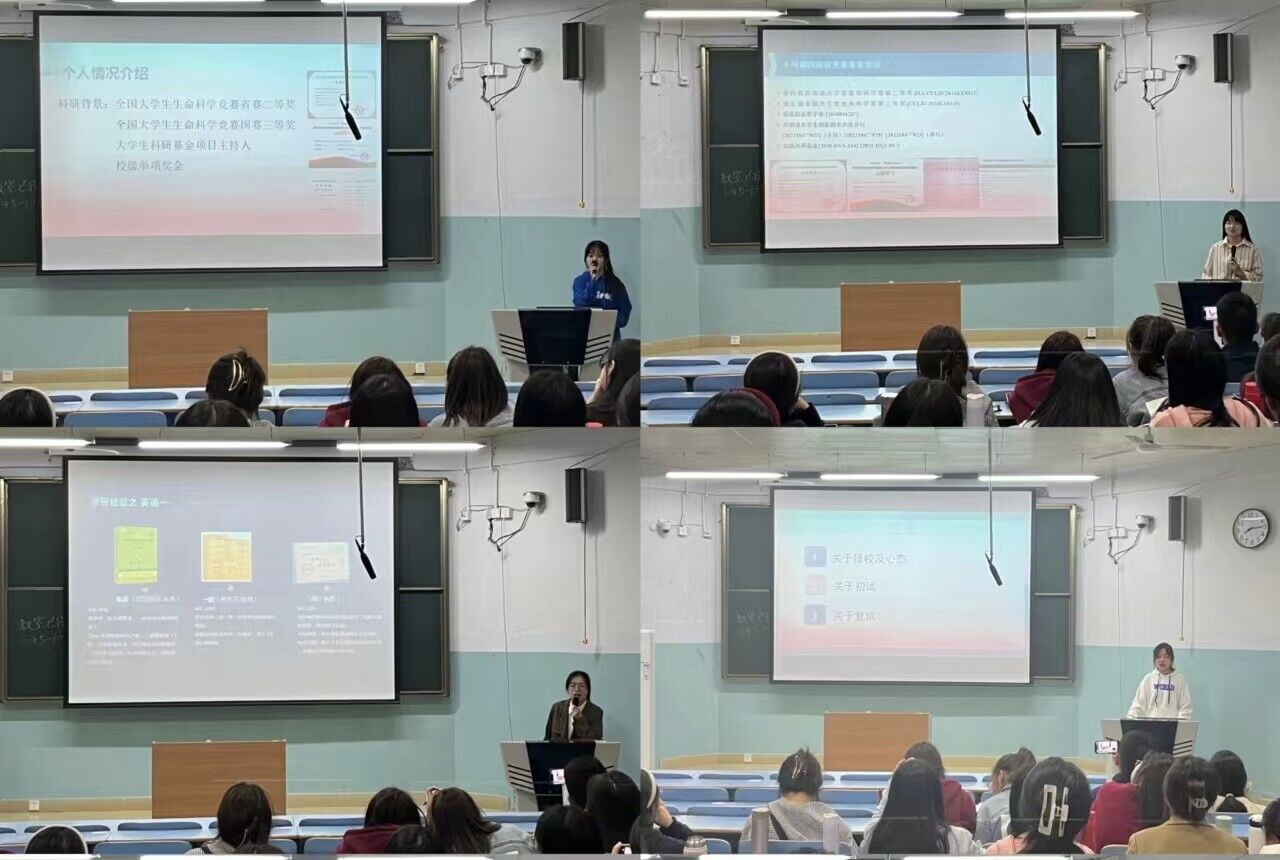 荣宪举结合我院今年考研实际,分析了今后形势,指出考研需要锲而不舍的毅力、专心致志和全力以赴,并建议学生进入实验室多做科研,发表文章,同时加强和专业老师交流与沟通,并强调考研并非唯一出路。我院2019级王亚帆、曹越、陈奕萌、李可、刘宏宇等8位考研成功学子,向大家介绍考研初试、复试以及跨考、调剂、和择校等方面的注意事项、分享自己的备考方法、推荐好用的书本和网络资源,对于不同的学科采用不同的复习方法。王亚帆提出建议:学习要有重点,背书之前根据内容制作思维导图,有意识地提高行动力和专注力;陈亦萌和李可等人都强调要学好英语,选择适合自己的学习方式,多背单词提高词汇量;曹越强调要整理真题,做好笔记;保持高效的学习效率,处理好人际关系,保持每天处于开心的状态;李可强调选择的重要性,建议大家慎重选择考研院校和学科,多背真题,提高写字速度、分章节去练习,书写要有条理性。现场互动中,同学们就考研注意事项进行了深入交流与探讨。