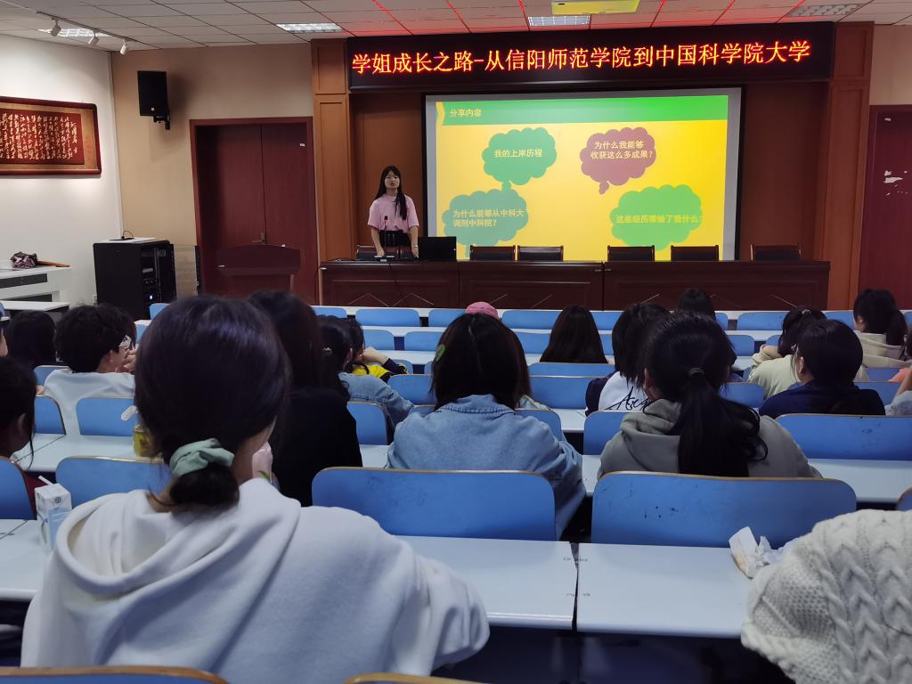 为进一步加深对大学生活的了解,充分获取学习经验,改进低年级学生的学习方法,明确学习目标,端正学习态度,我院邀请2019级王亚帆在生科楼414召开了题为“学姐成长之路-从信阳师范学院到中国科学院大学”的学习经验分享会,党委副书记荣宪举,副院长荆胜利和2021级、2022级学生参加了此次分享会。