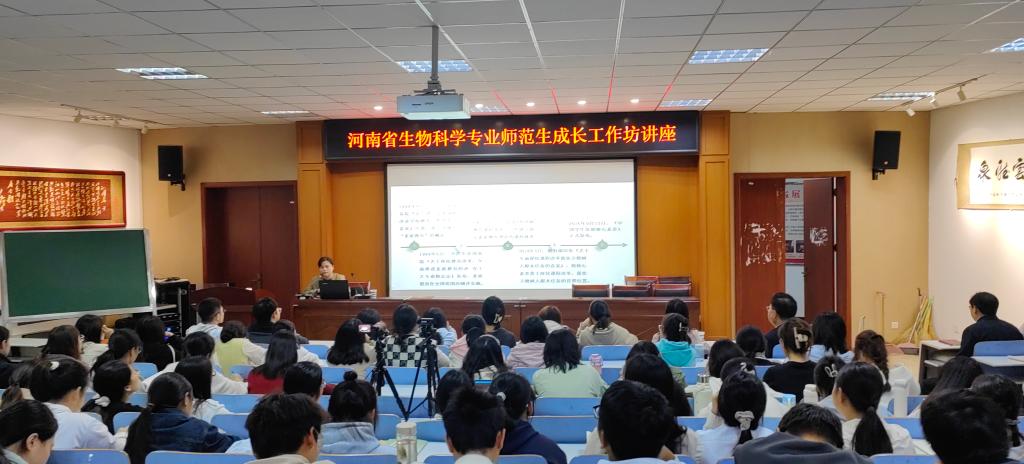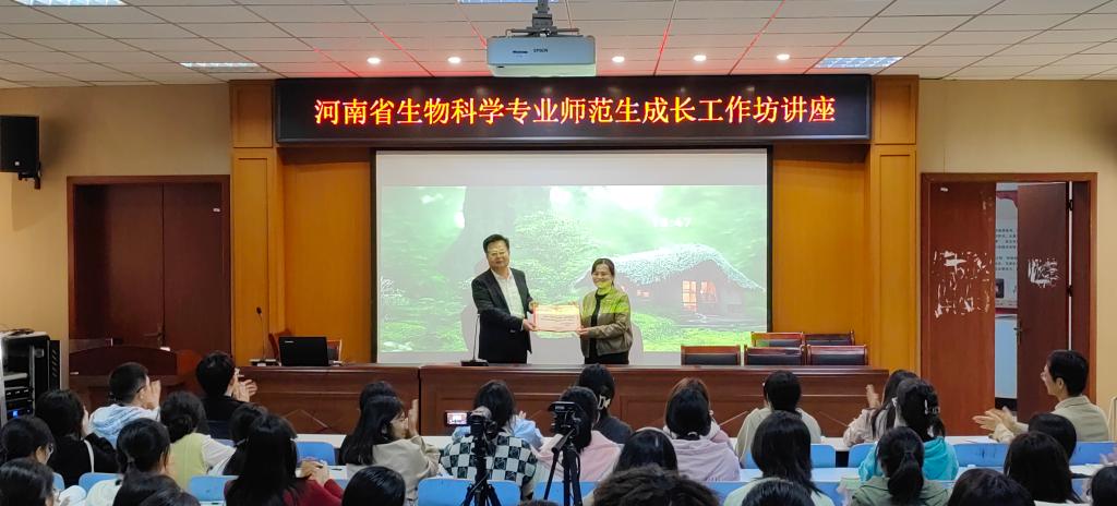 在讲座开始前,饶本强院长为王艳红颁发河南省生物科学专业师范生成长工作坊坊主聘书。随后,王老师深入解读中学生物学课程标准、教学与课程理念、师范生必备知识、关键能力,以及核心素养与生物学学科核心素养;她详细阐述了在教学设计中如何围绕教学目标、教学内容、教学活动、教学评价和作业,以及教学反思与板书等五个方面来体现核心素养,落实立德树人根本任务,实现课程育人价值。最后,王老师以省优质课为具体教学案例,分析教学设计各个环节如何更好地体现生物学核心素养。讲座结束后,同学们积极向王老师提问,王老师认真耐心的为同学们进行了解答,现场交流气氛十分热烈。