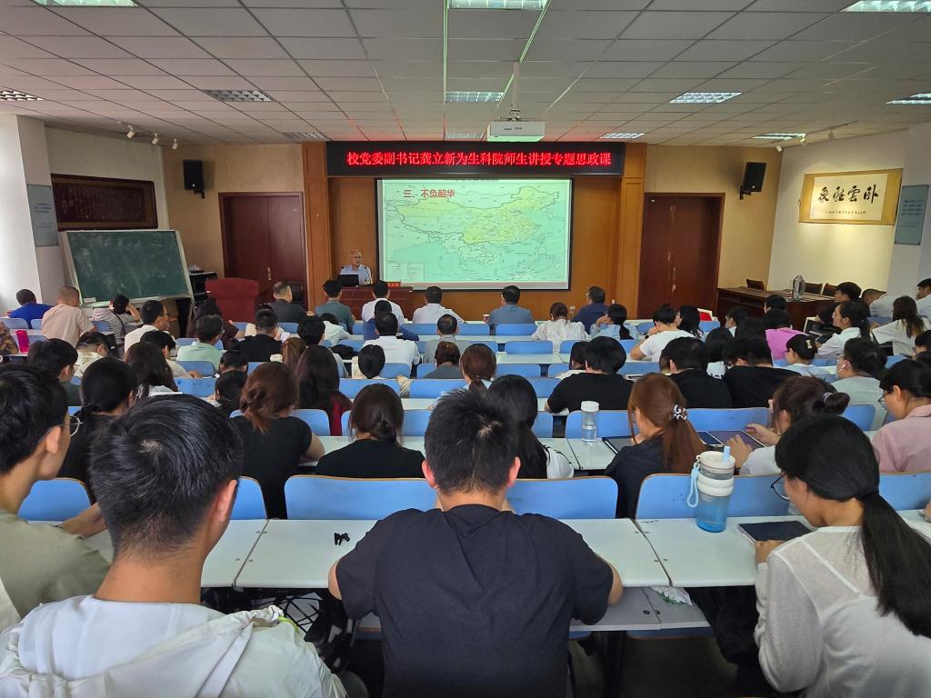 6月3日,校党委副书记龚立新在太阳成集团122ccvip414报告厅为我院师生讲专题思政课。学院全体党员、入党积极分子代表等200余人参加了思政课学习。