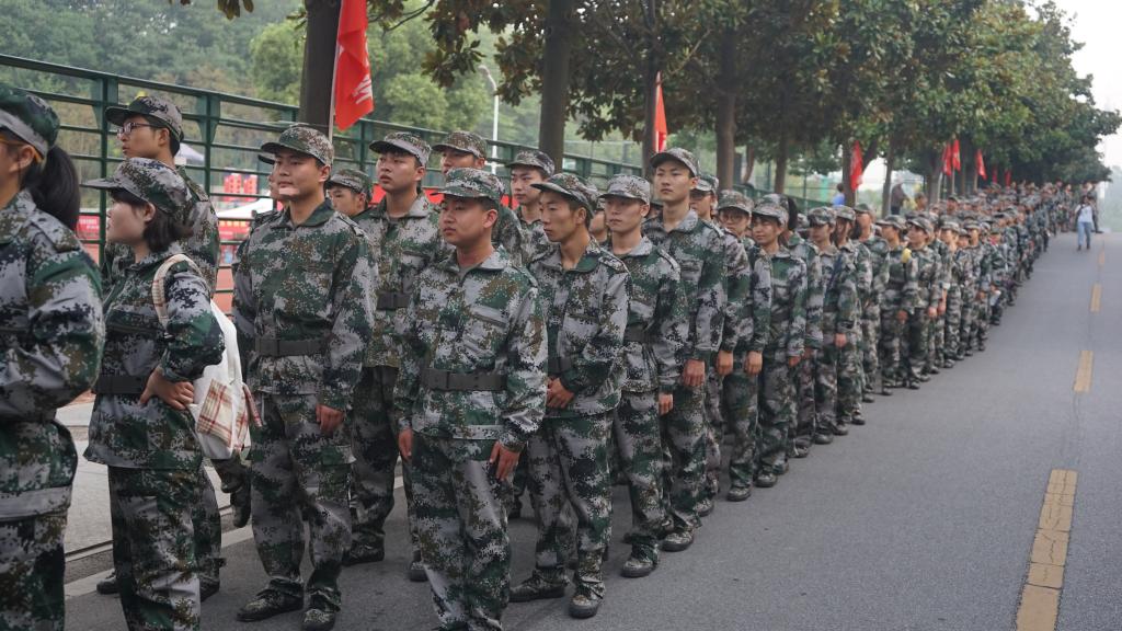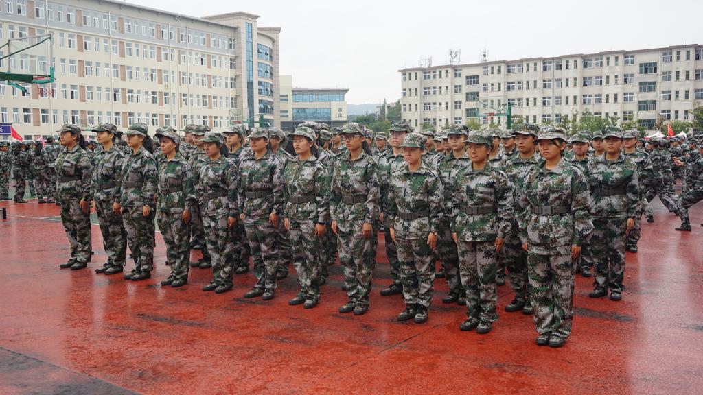 军训第一天,我院新生身着统一服装,排着整齐的队伍参加开学典礼暨军训动员大会。