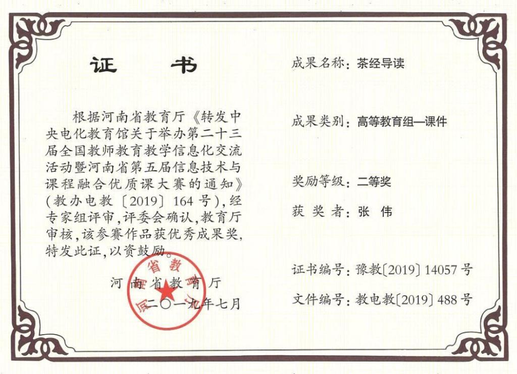 日前,河南省教育厅印发了《关于公布第二十三届全国教师教育教学信息化交流活动暨河南省第五届信息技术与课程融合优质课大赛评选结果的通知》(教电教〔2019〕488号)文件,我院张伟作品《茶经导读》荣获“高等教育组—课件”组优秀成果二等奖。