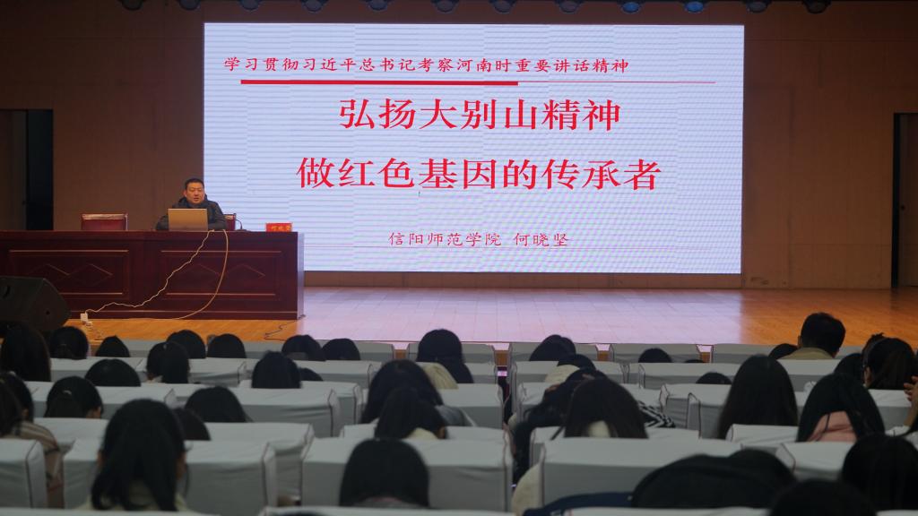何晓坚副书记以“弘扬大别山精神,传承红色基因”为主题展开讲述。他从“坚守信念,对党忠诚”、“胸怀全局,甘于奉献”、“依靠群众 团结奋斗”、“不畏艰苦,勇当前锋”四个方面展开讲述,引出大别山红色精神。他表示,“坚守信念,对党忠诚”就是要对党忠诚,永不背叛党,“胸怀全局,甘于奉献”就是在战争中不怕牺牲,勇于斗争,“依靠群众,团结奋斗”、“不畏艰苦,勇当前锋”就是把红色资源利用好,把红色传统发扬好,把红色基因传承好。活动最后,何晓坚为学子们详细讲解红色基因,提出当代青年学子要坚定理想信念、端正价值追求、砥砺意志品质,努力成为中国特色社会主义事业建设者和接班人。