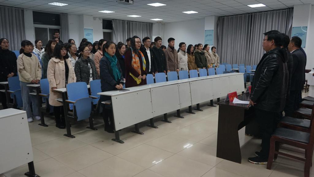 会议伊始,全体起立,奏唱《国际歌》。袁红雨宣读本次接收新党员名单。随后全体新党员起立,面对国旗庄严宣誓。新党员代表康菡,老党员代表郑梦圆,入党积极分子代表鲁文龙分别发言,分享自己在成为党员路上和将要入党的心路历程以及思想转变。院党委书记李向阳致辞,他代表院党委对新入党同志表示祝贺,并结合实事提出对新入党成员的建议。他希望党员们不辜负党组织的期望,充分发挥党的优良传统。牢记全心全意为人民服务的宗旨,牢记树立四个意识,在各自的岗位上胸怀国家,心系学习,加倍努心工作,充分发挥党员的先锋模范作用,做一名优秀的共产党员。此次宣誓仪式在国歌的演奏中落下帷幕。