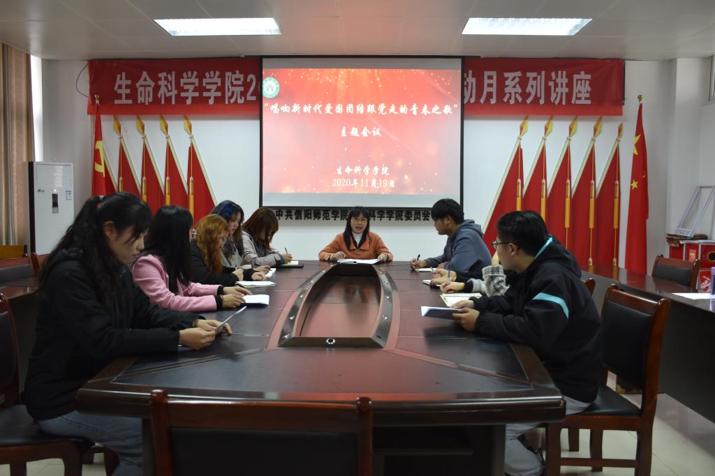 为深入贯彻落实全国青联十三届全委会和全国学联二十七大会议精神,11月19日下午,我院在生物楼412会议室召开了“唱响新时代爱国团结跟党走的青春之歌”主题会议。研究生工作秘书杨桂芳及主要学生干部参加了会议,会议由研究生分会工作人员李梦鸽主持。