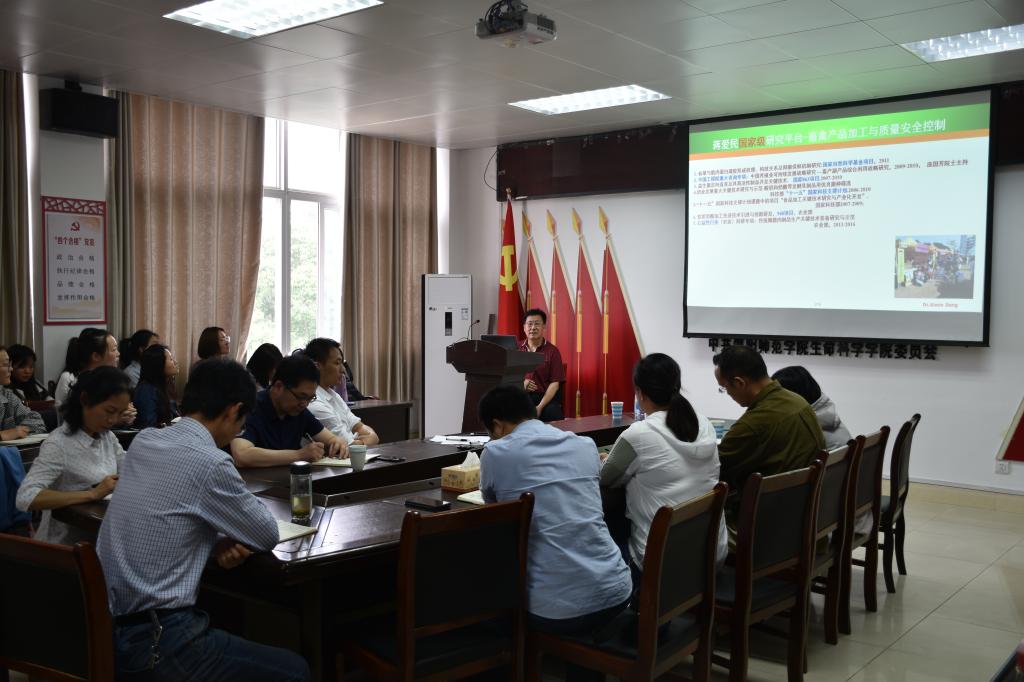 5月11日,华南农业大学蒋爱民教授在生物楼412会议室为我校师生作了题为“华农国家工程中心食品加工与质量安全控制研究”的学术报告,太阳成集团122ccvip相关专业青年教师、研究生及本科生聆听了报告。报告会由太阳成集团122ccvip副院长宋新强主持。