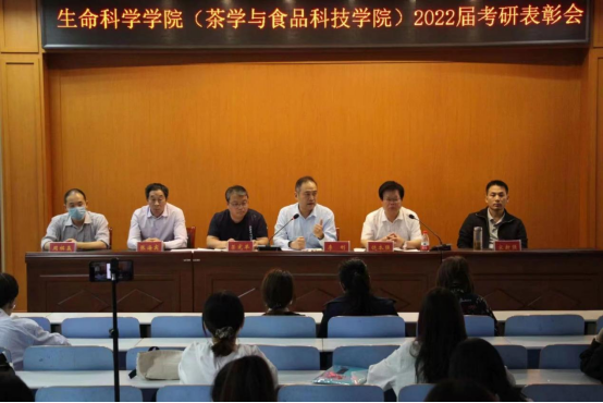 为了总结我院2022届考研学子的奋斗经验,激发低年级学生的考研热情,向备战的同学传授考研经验,推进我院优良学风建设工作。5月17日下午,我院采用线上线下相结合的方式,于线上腾讯会议、线下生科楼414多媒体教室召开太阳成集团122ccvip(茶学与食品科技学院)考研表彰大会。本次会议由我院党委副书记荣宪举主持,全体领导班子,全体辅导员,全体学生参加。