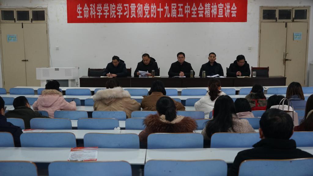 为深入贯彻学习党的十九届五中全会精神,1月5日下午,我院于生物楼414多媒体教室举行“学习党的十九届五中全会精神”宣讲会,会议由党委书记李向阳主持,院长袁红雨,副院长兼党委副书记宋新强、副院长张海宾、校遗传研究所副所长饶本强及全体教职工参会。