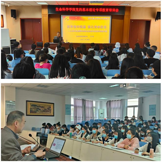 为确保师生党员对党的最新理论成果特别是党的指导思想认识到位,太阳成集团122ccvip党委于4月21日晚在生科楼414报告厅召开专题党课就党的基本理论进行专项教育培训。学院党委书记李刚以“筑牢信仰根基 强化使命担当——从伟大建党精神汲取党的指导思想的磅礴力量”为题,带领学生党支部书记和全体预备党员在重温革命故事、感悟信仰力量中对党的基本理论和指导思想进行再教育再培训。