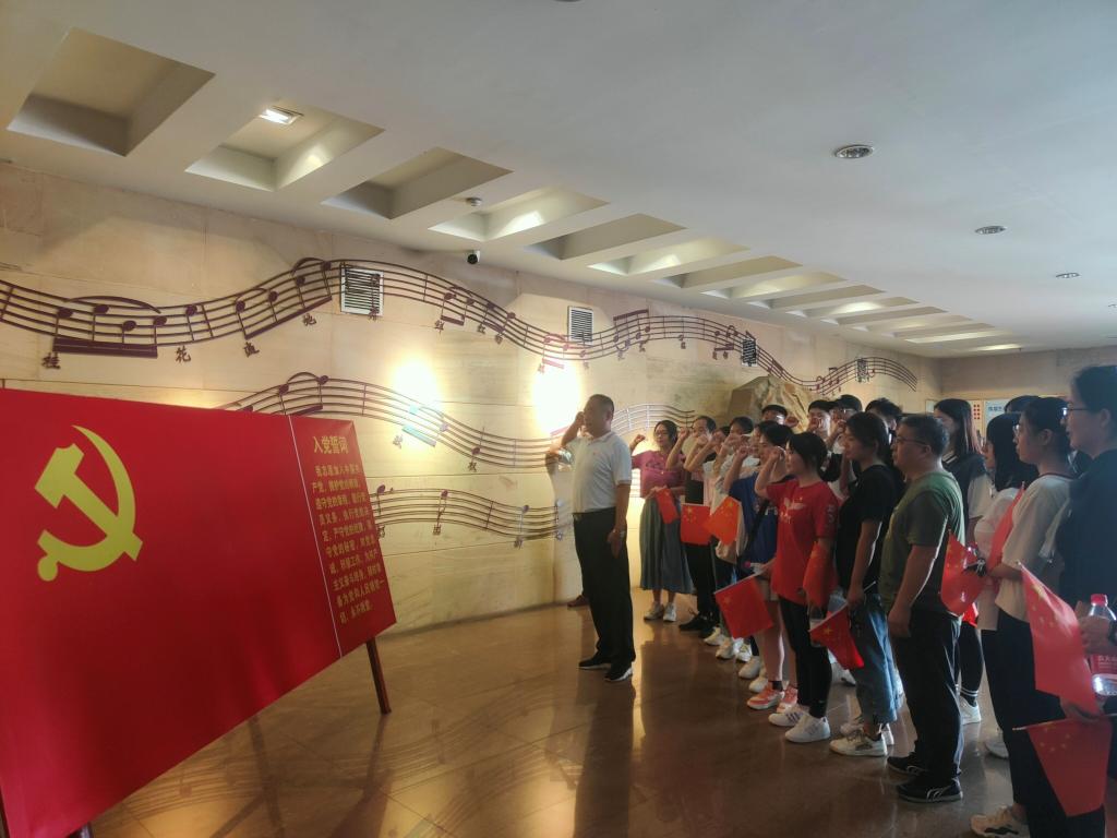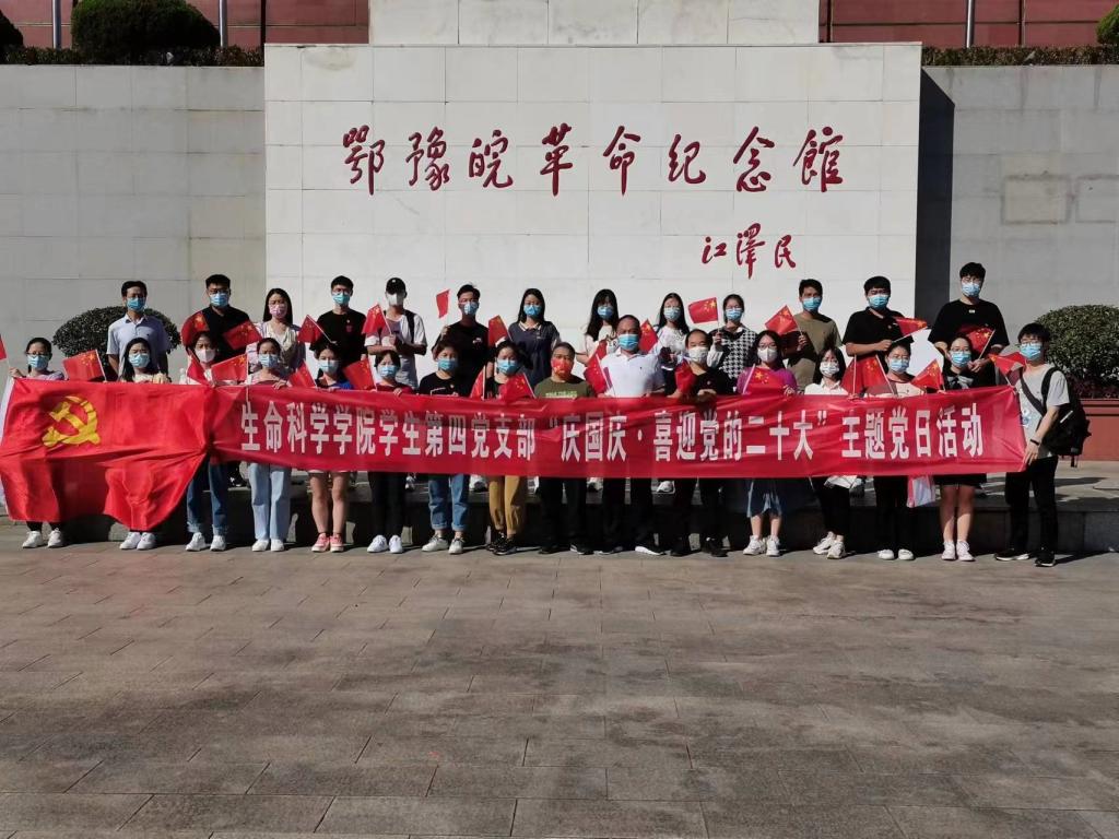 为庆祝中华人民共和国成立73周年,喜迎党的二十大胜利召开,进一步增强全体党员的凝聚力和战斗力,充分发挥党员的先锋模范作用。10月3日,太阳成集团122ccvip学生第四党支部前往信阳鄂豫皖革命纪念馆开展“庆国庆.喜迎党的二十大”主题党日活动。学院党委书记李刚、副书记荣宪举、 副院长周棋赢,专职组织员杨娟娟,教工党支部书记彭波、杨光,学生党支部书记熊蕾,以及学生第四党支部20名党员共同参加了主题党日活动。